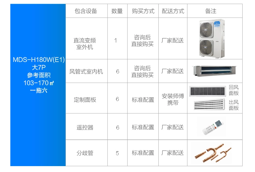 美的 一拖六變頻一級能效 多聯(lián)風管機 7匹 家用中央空調(diào) MDS-H180W(E1)